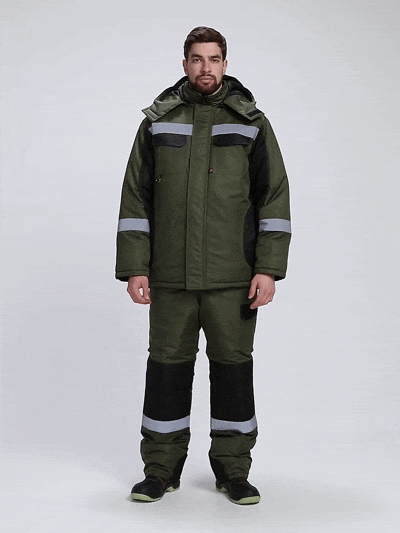 КУРТКА: - прямого силуэта, с центральной застёжкой на тесьму «молния» и утепленную ветрозащитную планку застёгивающеюся на ленты–контакт - ветрозащитная планка настрачивается от линии втачивания воротника до низа изделия - куртка с притачной утепленной подкладкой, со съёмным утеплённым капюшоном - полочки с верхними накладными фигурными карманами, состоящими из двух частей - в нижней части расположены внутренние карманы с вертикальным входом, застегивающимися на молнию - рукава втачные, в боковых частях рукава фигурные вставки из отделочной ткани - воротник втачной, стойка - капюшон утепленный, состоит из центральной и боковых частей, пристёгивается к куртке на тесьму «Молния», регулируется по лицевому вырезу шнуром - верхняя часть капюшона с регулировочной патой фиксируется на ленту-контакт, по лицевому вырезу вставлен стеганый козырек - СОП 50 мм ПОЛУКОМБИНЕЗОН: - с центральной застёжкой на тесьму «молния» - высота сиденья регулируется бретелями с открытыми участками помочной резинки и фастексами