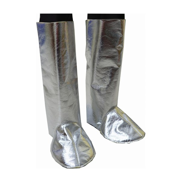 Застежка сзади на огнестойкую контактную ленту, кожаные ремешки под подошвой для фиксации, возможность регулировки, высота 38 см. Комплект 2 шт. Состав: алюминизированная пара-арамидная ткань. 100% - пара-арамид алюминизированный. Плотность: 460 г/м2 Высота: 38 см. Защитные свойства по ГОСТ ISO 116