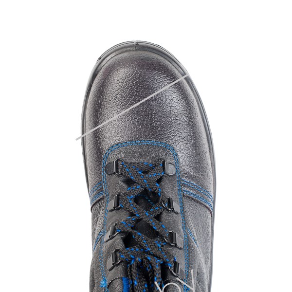 Ботинки изготовлены методом литья к заготовке верха обуви промежуточного слоя подошвы из полиуретана, с ходовым слоем из резины на основе нитрильного каучука. Имеется пристроченная прилитая задинка. Верх ботинок из натуральной кожи. Подкладка из текстильного материала. В верхней части ботинок мягкий кант. Ботинки завязываются на шнурки и имеют глухой клапан. Шнуровка с использованием металлических люверсов. На глухом клапане мягкая вставка из поролона. Стелька вкладная. В носочной части внутренний термопластичный подносок ударной прочностью 5 Дж. На боковинах световозвращающие элементы в виде полосок. Контрастная отстрочка синего цвета в тон подкладки и цветной нити на шнурках. Подошва двухслойная, маслобензостойкая, ходовой слой из износостойкой, термостойкой резины на основе нитрильного каучука. Подошва выдерживает температуру 300С при контакте с нагретыми поверхностями. Внутренняя амортизирующая вставка в пяточной части подошвы. Глубина профиля ходового слоя подошвы 3,5 мм. Цвет ботинок черный.