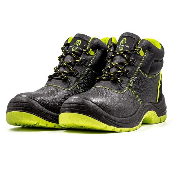 Демисезонные ботинки на двухслойной ПУ/ТПУ (полиуретановой) подошве. Обувь изготовлена из кожи устойчивой к воздействию агрессивных внешних факторов. Носок защищен металлическим подноском с ударной нагрузкой до 200 Дж. Подкладка ботинок из дышащей трехслойной 3D AirMesh ткани цвета лайм. Подошва изг