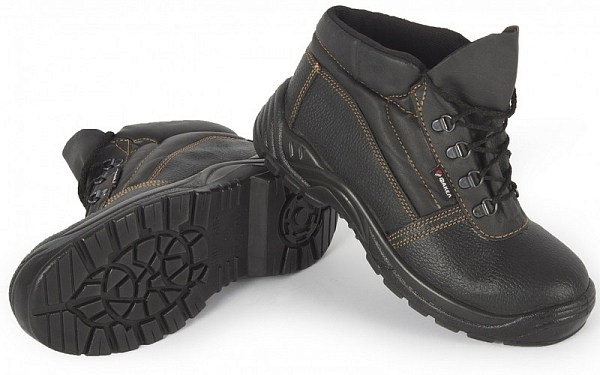 БОТИНКИ: подошва: однослойная, полиуретановая ПУ союзка, задник и берцы: натуральная кожа КРС 1,8-2 мм манжет/мягкий кант и глухой клапан: винилуретанискожа с промежуточным слоем из пенополиуретана металлический подносок – защита от ударов 200 Дж стелька: вкладная ЭВА подкладка: текстильный материал