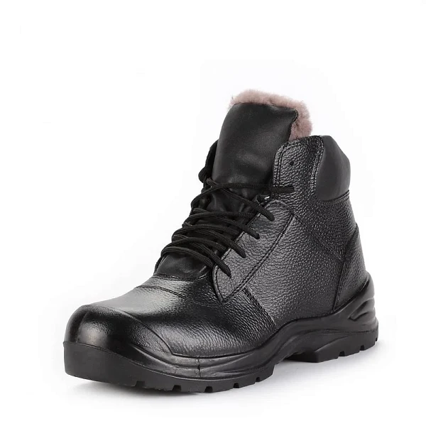 Ботинки зимние рабочие из натуральной кожи с глухим клапаном утеплённые натуральным мехом с поликарбонатным подноском на подошве из полиуретана и резины на основе нитрильного каучука Обувь имеет защиту от термических рисков электрической дуги. Контакт с нагретыми поверхностями до +160°С в течение 30