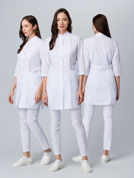 ХАЛАТ: приталенного силуэта воротник-стойка рукав 3/4 два боковых кармана со скошенным входом один нагрудный карман для пропуска застежка на кнопки декоративный пояс спереди на кнопках по спине вшитый пояс для регулировки объема можно носить как отдельно, так и с медицинскими брюками «Классик»