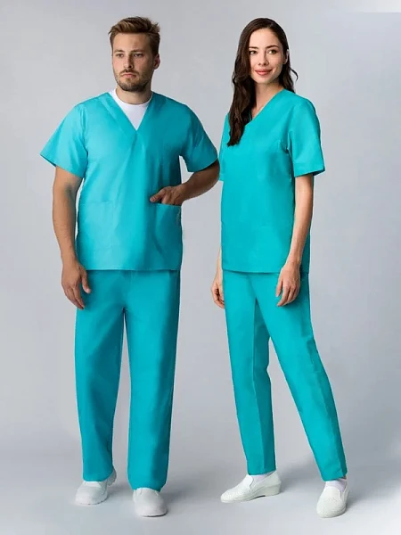 БЛУЗА: удлиненная свободного силуэта короткий втачной рукав V-образный вырез воротника боковые вместительные карманы небольшой нагрудный карман боковые разрезы БРЮКИ: прямого силуэта на притачном поясе на резинке