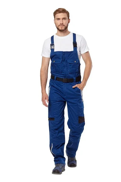 Полукомбинезон летний и демисезонный из смесовой ткани синего цвета с деталями из эластичного трикотажа черного цвета, для защиты от общих производственных загрязнений. • Застежка: молния • Карман