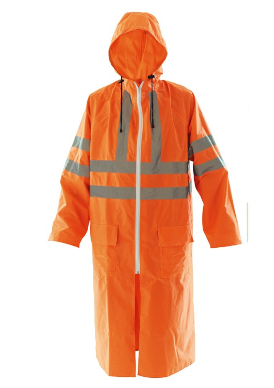 Изделие повышенной видимости 3-го класса, для защиты от воды 3-го класса. Плащ для защиты от воды с застежкой на молнию с ветрозащитной планкой, имеет капюшон, накладные карманы с влагозащитными клапанами, прошитые и герметично проклеееные швы, манжеты на рукавах. Спинка с кокеткой, отверстиями для вентиляции, закрытыми клапаном. Объем капюшона регулируется по лицевому вырезу шнуром. Светоотражающие полосы шириной 50 мм. Ткань: таффета с ПВХ покрытием плотностью 225 гр./м2 Цвет: Водоупорность: 5000 мм. водного столба. Размер/Рост: с 44-46 по 56-58/170-176 по 182-188 Гост: 12.4.288-2013, 12.4.281-2014; ТР ТС 019/2011 Защитные свойства: Сигнальная одежда