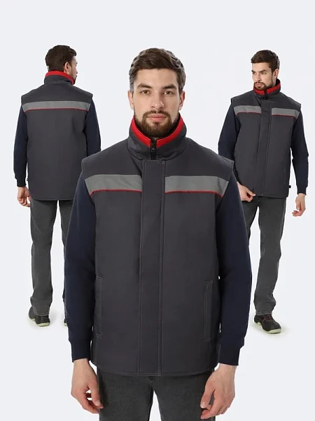 Жилет прямого силуэта с притачной утепляющей подкладкой Воротник-стойка, внутренняя стойка выполнена из флиса. Центральная застежка на прочную молнию с внешним ветрозащитным клапаном, фиксирующимся на кнопки. Внутренняя планка под молнией огибает замок сверху, что исключает соприкосновение фурнитуры