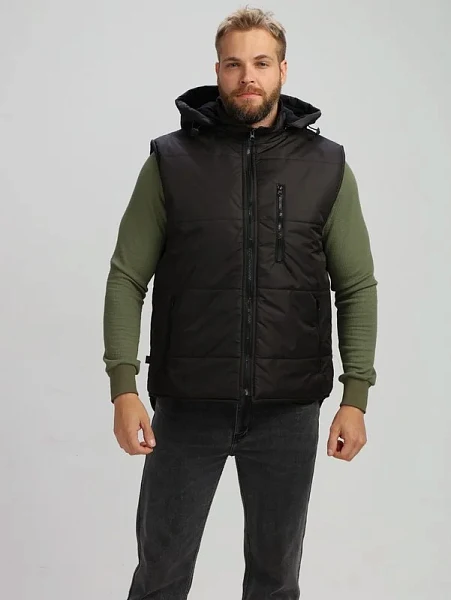 ЖИЛЕТ: прямого силуэта с центральной застёжкой на тесьму – «молния» полочки с боковыми накладными карманами с застёжкой на одну кнопку спинка удлинённая с разрезами в области боковых швов, углы разрезов скругленные воротник «стойка» подкладка флис отстегивающийся капюшон на молнии