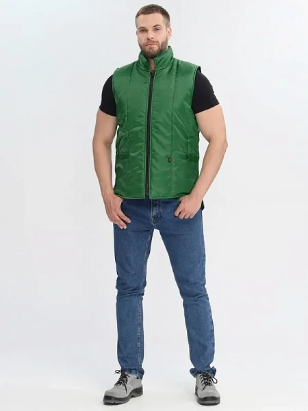 ЖИЛЕТ: прямого силуэта с центральной застёжкой на тесьму – «молния» полочки с боковыми накладными карманами с застёжкой на одну кнопку спинка удлинённая с разрезами в области боковых швов, углы разрезов скругленные воротник «стойка»