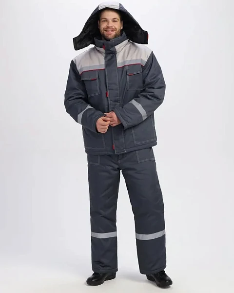 КУРТКА: прямого силуэта, без кулиски 4 накладных кармана с клапанами центральная застежка на молнию с клапаном ветрозащитным на ленте контакт СОП 50 мм по кокетке и спинке капюшон отстегивающийся на молнии рукава без манжет БРЮКИ: с утепленным поясом со шлевками под ремень два накладных боковых карм