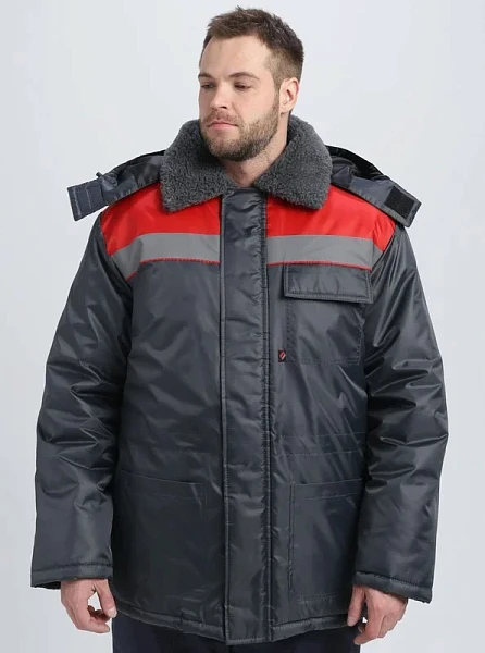 КУРТКА: центральная застежка молния с ветрозащитной планкой воротник утепленный из искусственного меха регулируемый съемный утепленный капюшон накладные нагрудный и боковые карманы регулировка объема по линии талии трикотажные манжеты СОП 50 мм по кокетке