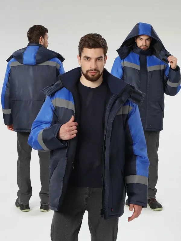 КУРТКА: Прямой силуэт с центральной застежкой на двухзамковую молнию и утепленной ветрозащитной планкой на 5 участках «липучки» для надежной защиты от непогоды Кокетки из отделочной ткани и светоотражающие полосы (СОП 50 мм) для безопасности Съемный утепленный капюшон с системой регулировки по овалу