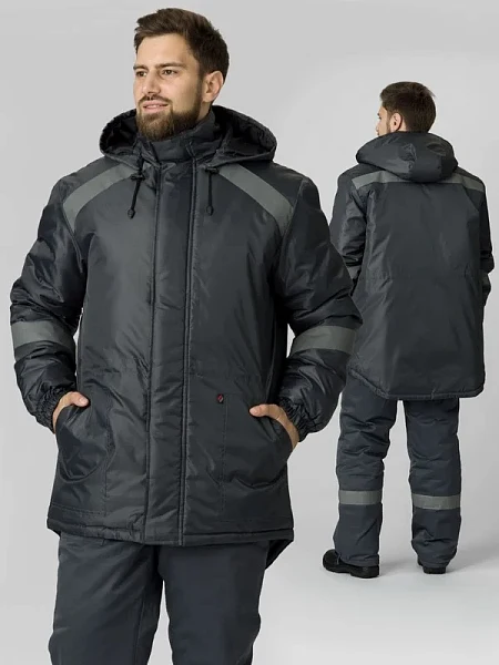 Костюм Урбанкор® - зарегистрированный и охраняемый Товарный Знак в 9 и 25 классах МКТУ (заявка в РОСПАТЕНТ № 2025793198) КУРТКА: прямого силуэта с центральной застёжкой на тесьму молнию с ветрозащитной планкой с застёжкой на четыре «ленты контакт» со съёмным утеплённым капюшоном по линии талии на ку