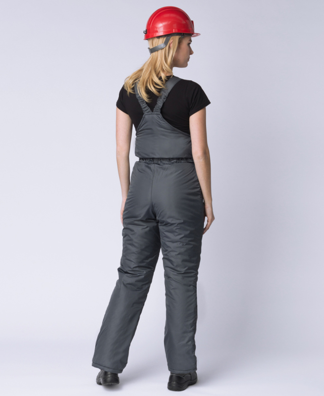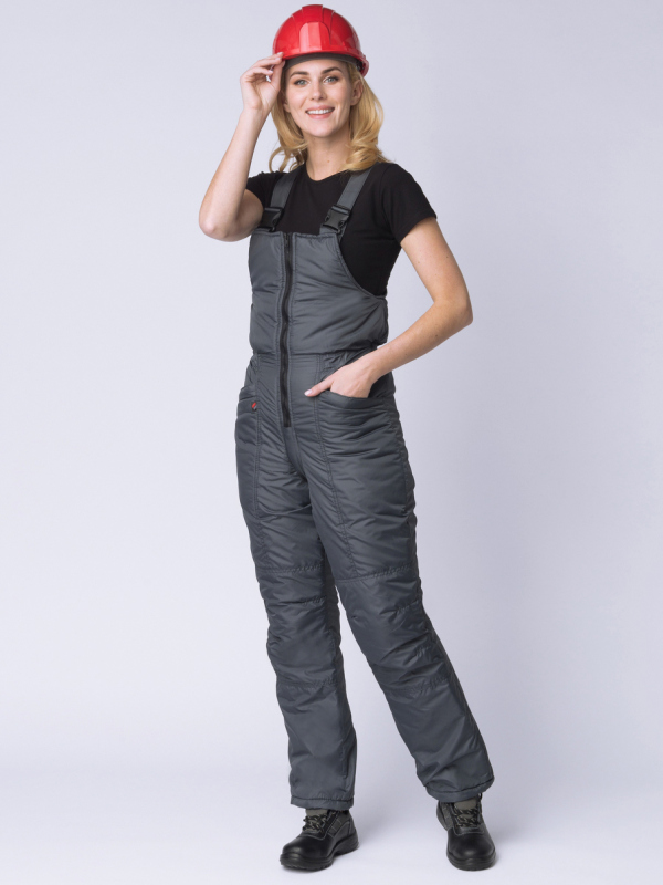 ПОЛУКОМБИНЕЗОН: - прямого силуэта - с центральной застёжкой на тесьму – «молния» - передние половинки состоят из шести частей: кокетки, центральные, верхние и нижние боковые, наколенник, нижние - передние половики полукомбинезона на кокетках из отделочной ткани - в шов притачивания кокеток вставлен светоотражающий кант - передние половинки с рельефными швами и с боковыми внутренними карманами с наклонным входом - по линии талии, с изнаночной стороны изделия, настрочена эластичная тесьма для прилегания изделия по фигуре - наколенники с вытачками в боковых и шаговых швах и притачиваются к верхним и нижним частям полукомбинезона - задние половинки цельнокроеные - с бретелями, регулирующимися по длине закрытой эластичной тесьмой и фастексами - бретели и держатели фастексов из отделочной ткани - утеплитель с подкладкой простеган вертикально