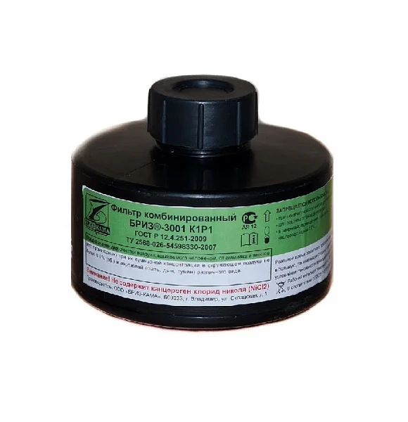 ФИЛЬТР: -фильтр комбинированный Бриз-3001 К1Р1D предназначен для очистки загрязнённого воздуха от аэрозольных частиц малотоксичных веществ, содержащихся в пыли, дыме или тумане, а также от аммиака и аминов -корпус фильтра изготовлен из специальной пластмассы -соединительная резьба -соответствует ГОС