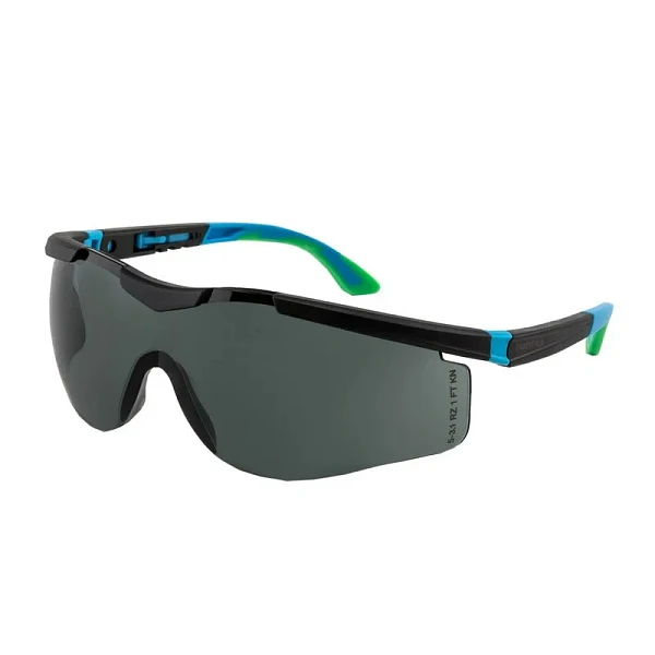 ОЧКИ: - легкие универсальные очки с регулировкой угла наклона защитного стекла и длины заушников, с мягкими заушниками из материала Evoprene защитное стекло-светофильтр серого цвета из поликарбоната с водостойким двусторонним твердым и незапотевающим покрытием, обеспечивает защиту от высокоскоростн