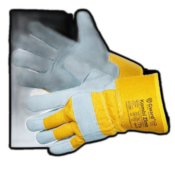 Перчатки комбинированные из спилка серого цвета и золотистой ткани, утеплены искусственным мехом типа "овчина"
