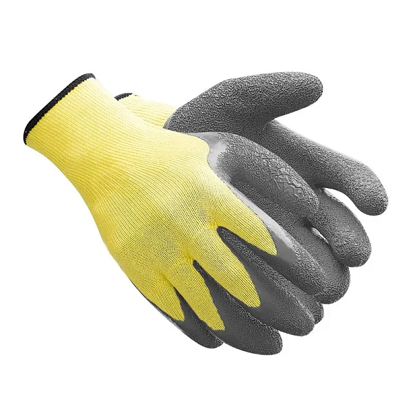 Трикотажные перчатки с пенорезиновым покрытием для защиты от механических воздействий и общих производственных загрязнений. Перчатки представляют собой бесшовную трикотажную основу, на которую в области ладони и кончиков пальцев нанесено резиновое покрытие. Основа перчаток изготовлена из волокон, об