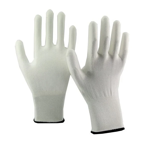 Белые нейлоновые перчатки с полиуретановым покрытием ладони и пальцев. Бесшовная «дышащая» основа из нейлона с плотностью вязки 13 петель на дюйм обеспечивает тактильную чувствительность. Полиуретановое покрытие дает эффект «липкости», что исключает проскальзывание предметов. Анатомическая форма сни