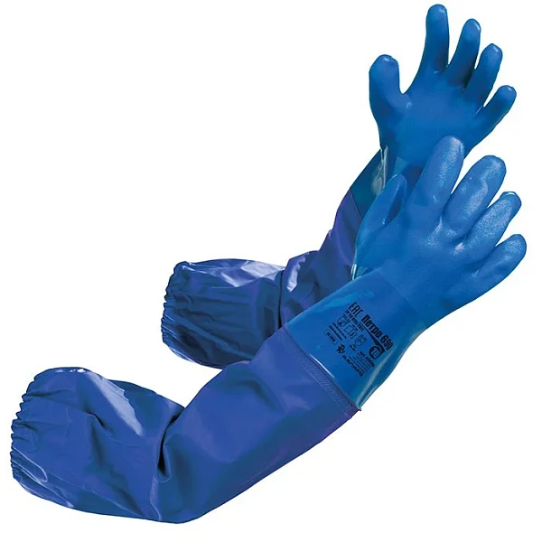 Перчатки из хлопчатобумажного трикотажа с припаянным нарукавником из модифицированного поливинилхлорида для защиты от механических воздействий, нефти, нефтепродуктов, минеральных масел, кислот и щелочей. Основа перчатки - х/б трикотаж, за счет текстурного ПВХ покрытия позволяют работать со скользким