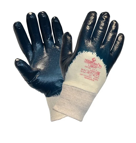 ПЕРЧАТКИ: материал основы: интерлок, хлопок 100% материал покрытия: нитрил, покрытие ладони и пальцев цвет: темно-зеленый манжета: трикотажная манжета эксплуатационные уровни EN: EN388 – 4111 защитные свойства ТР ТС: Ми Мп Нс Нм класс риска: 2 длина, мм: 270 Перчатки нитриловые DIGGERMAN LIGHT РП об
