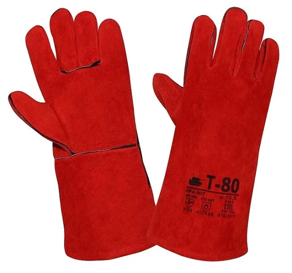 Перчатки сварщика (краги) Т-80 спилковые красные предназначены для защиты рук от механического воздействия (истирание, прокол, порез), искр и брызг расплавленного металла и работ в условиях повышенных температур. Перчатки пятипалые с подкладкой из флиса и брезента, длина 350 мм (+10/-5мм). Окрашенны
