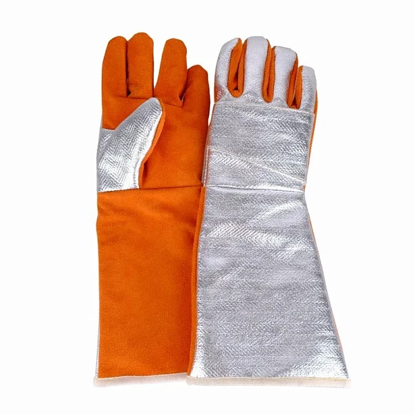 СИЗ рук внешняя часть из алюминизированного арамидного волокна (дополнительная вставка снаружи для повышенной защиты кисти), ладонная сторона из термостойкого кожевенного спилока, внутренняя подкладка из шерсти и нетканого материала  (от открытого огня, конвективного тепла, теплового излучения, искр