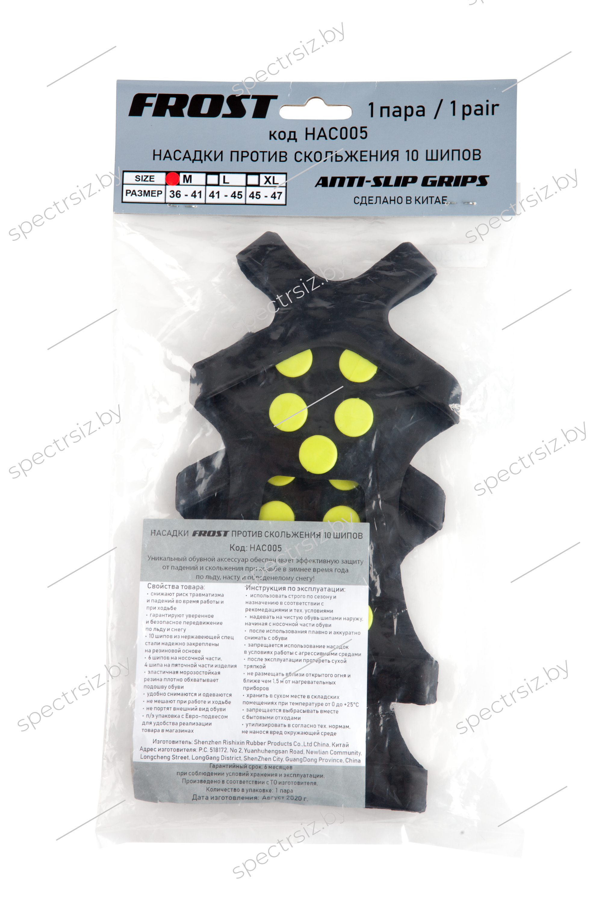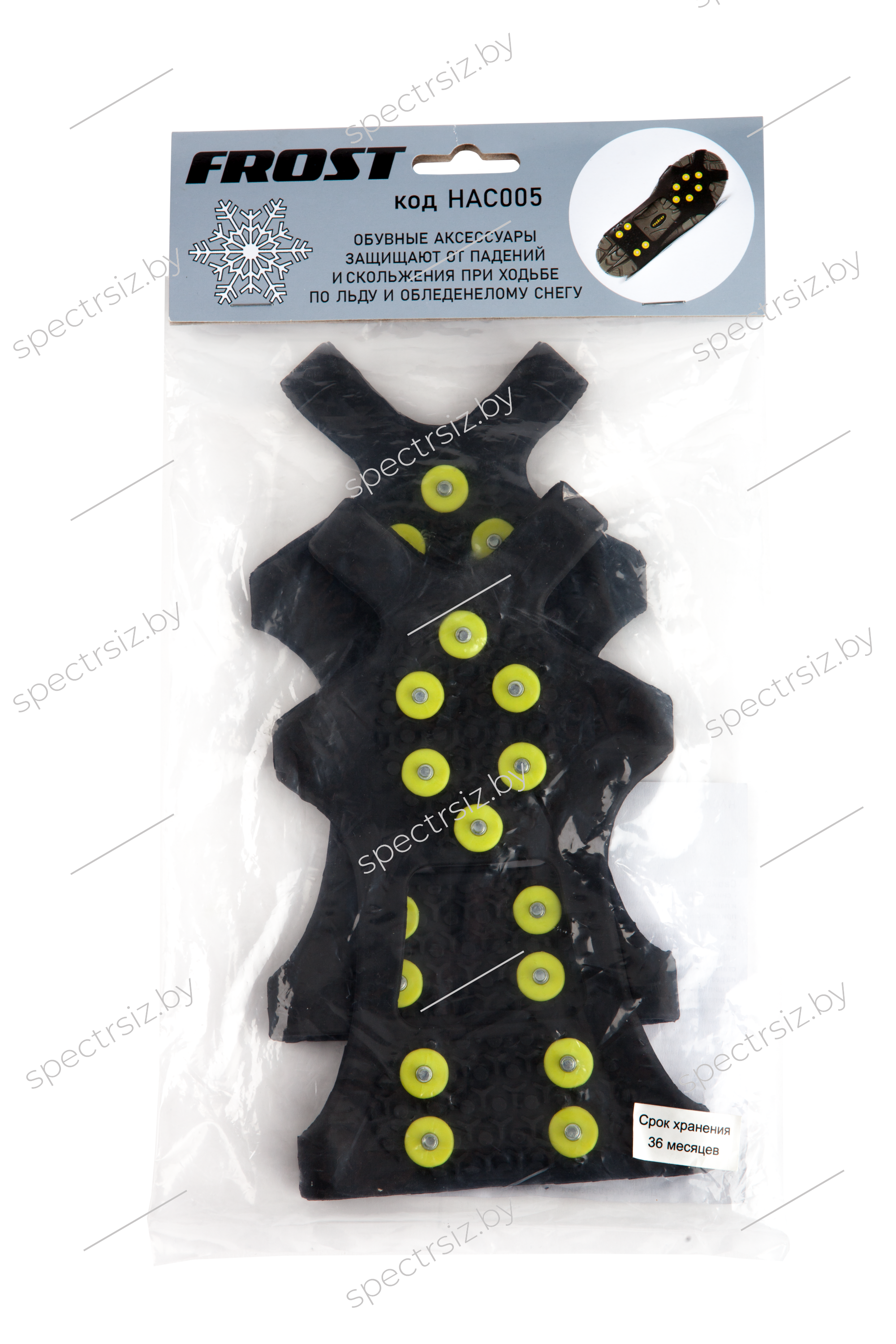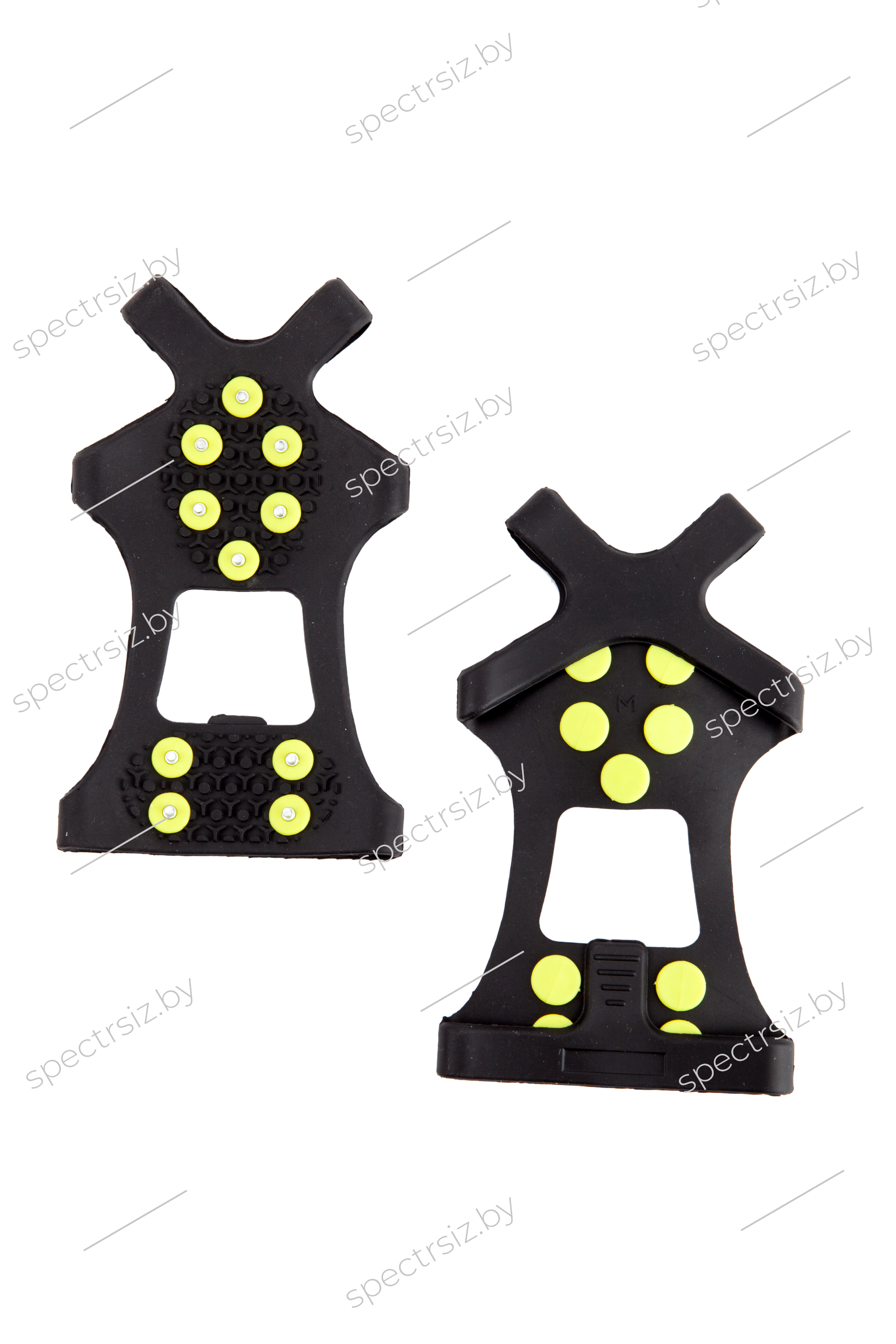 В резиновую основу равномерно по всей длине встроено 10 шипов высотой 4 мм: 6 шипов в носочной части и 4 шипа в пяточной части. Шипы изготовлены из спец стали с антикоррозийным покрытием, надежно закреплены в посадочные гнёзда из жесткого полипропилена. Шипы обладают повышенной прочностью и стойкостью к истирающим нагрузкам.