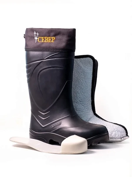 Сапоги мужские "Север" выполнены из современного материала ЭВА с комбинированной надставкой, с защитным полимерным подноском и стелькой, с двухслойным вкладным утеплителем из нетканного ворсового полотна с фольгированной прослойкой и искусственного меха с добавлением волокон натуральной шерсти. Обув