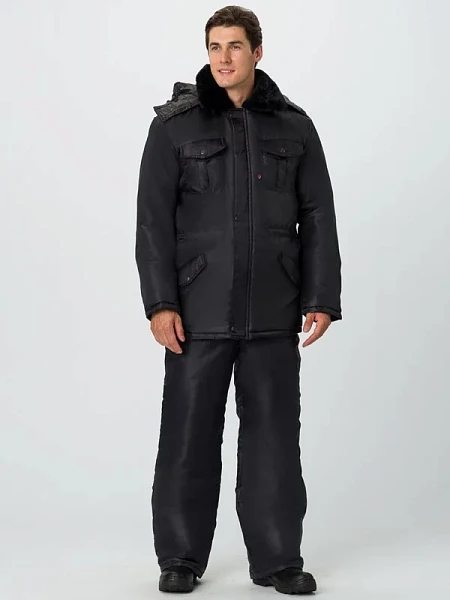 КУРТКА: отложной вортник воротник утепленный из искусственного меха центральная застёжкой на молнию ветрозащитная утепленная планка нагрудные и боковые карманы с клапанами регулировка объема по линии талии БРЮКИ: на регулируемых по длине бретелях широкий утепленный пояс гульфик с застежкой на три пе