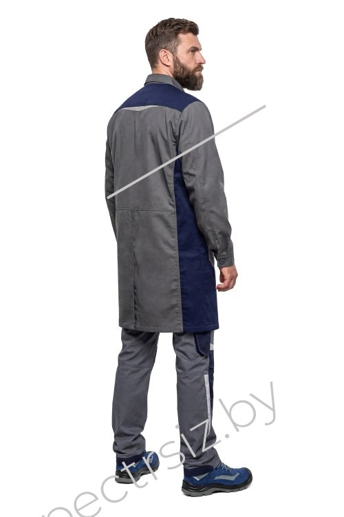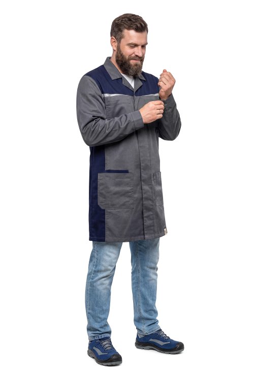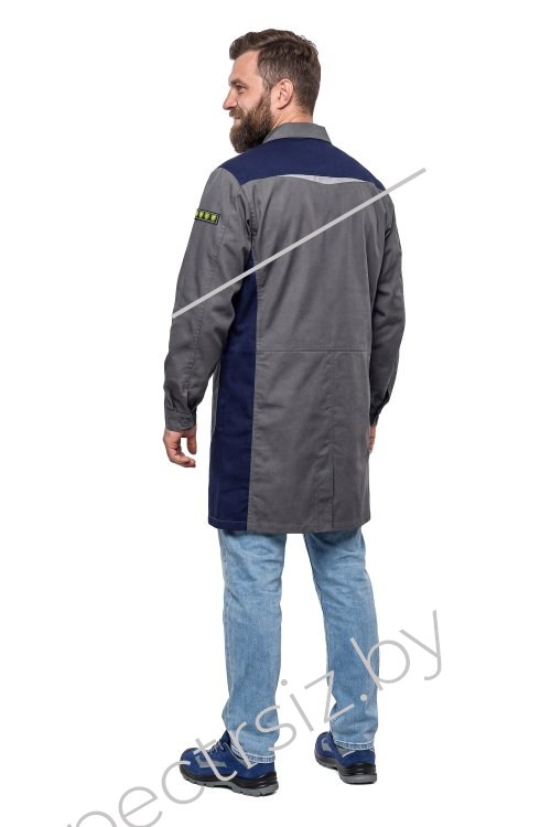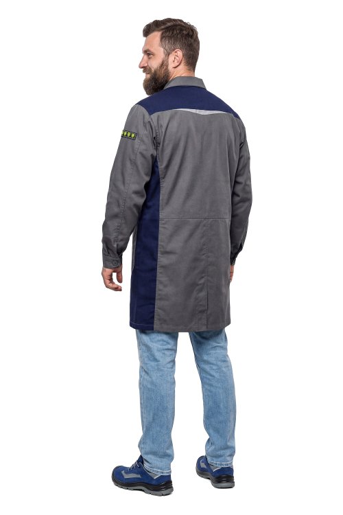 Халат из антистатической смесовой ткани с повышенным содержанием хлопка, с масловодоотталкивающей отделкой, для защиты от воздействия статистического электричества, общих производственных загрязнений и механических воздействий (истираний). Каждое изделие в индивидуальной упаковке из спанбонда.
