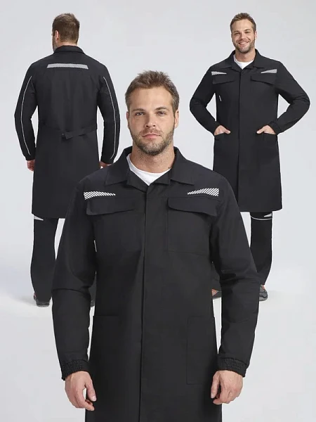 ХАЛАТ: Классический прямой силуэт с супатной застежкой на пять кнопок Светоотражающие элементы: сегментированные термоленты на нагрудных кокетках и спинке, а также кант в локтевых швах для безопасности в условиях недостаточной видимости Функциональная система хранения: четыре вместительных кармана,