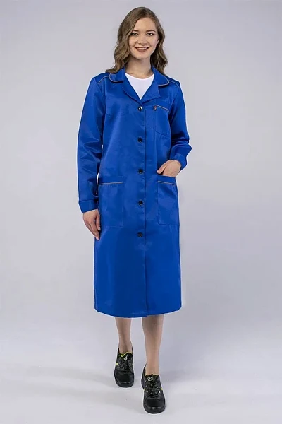 ХАЛАТ: длина ниже колена центральная застежка на петли и пуговицы отложной воротник регулировка объема по талии поясом нагрудный карман с открытым входом нижние карманы с открытым входом кант по кокетке манжеты на пуговице