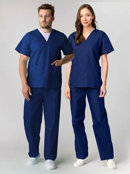 Возможен разнотон! БЛУЗА: удлиненная свободного силуэта короткий втачной рукав V-образный вырез воротника боковые вместительные карманы небольшой нагрудный карман боковые разрезы БРЮКИ: прямого силуэта на притачном поясе на резинке