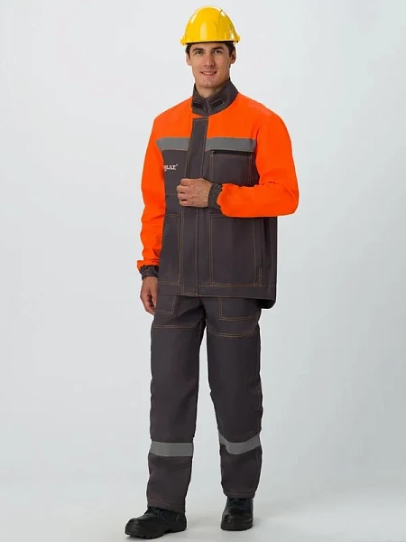 Состав ткани: хлопок 51%, полиэфир 49% Плотность: 215 г/м2 Цвет основной ткани: серый Цвет отделочной ткани: оранжевый Куртка прямого силуэта с удлиненной спинкой. Застежка: центральная на тесьму-молнию с ветрозащитной планкой. Перед куртки с прямой притачной кокеткой. Карманы: нагрудный левый карма