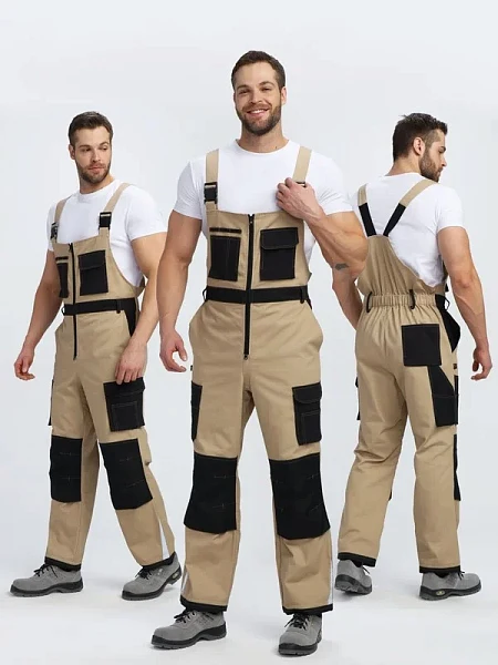 ПОЛУКОМБИНЕЗОН: прямого силуэта с передней застежкой «гульфик» на тесьму-«молния» на передних половинках расположены боковые карманыс отрезными бочками из отделочной ткани на левой передней половинке расположен нижний накладной карман с клапаном из отделочной ткани на карман настрачивается малый нак
