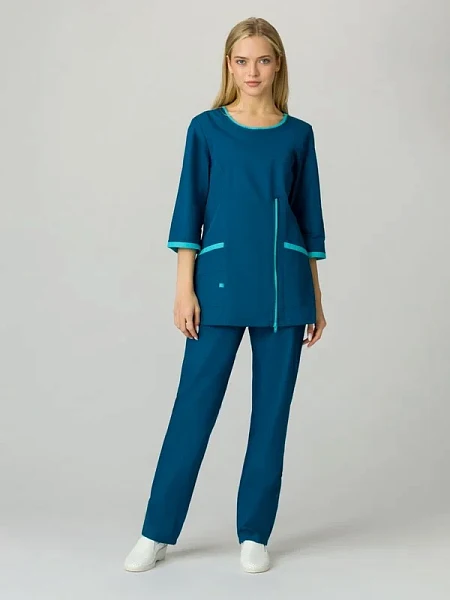 БЛУЗА: полуприталенный силуэт без центральной застежки круглый вырез горловины рукав 3/4 боковые карманы с окантовкой контрастного цвета нагрудный уменьшенный карман боковая молния до линии груди БРЮКИ: на резинке длина регулируется