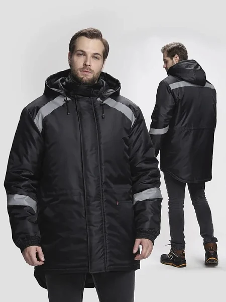 Костюм Урбанкор® - зарегистрированный и охраняемый Товарный Знак в 9 и 25 классах МКТУ (заявка в РОСПАТЕНТ № 2025793198) КУРТКА: прямого силуэта с центральной застёжкой на тесьму молнию с ветрозащитной планкой с застёжкой на четыре «ленты контакт» со съёмным утеплённым капюшоном по линии талии на ку