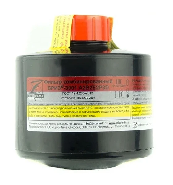 Фильтр комбинированный Бриз-3001 A2B2E2P3D применяется для очистки вдыхаемого загрязненного воздуха от: газов и паров органических веществ с температурой кипения выше 65°С (например: бензол, ксилол, толуол, бензин, керосин и др.) неорганических веществ (например: галогены, сероводород, синильная кис