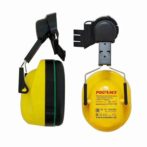 Наушники с креплением на каску. Избирательное поглощение шума: наушники защищают от воздействия шума до 112 дБ (SNR=32дБ). Регулируемые по высоте держатели с адаптерами, с помощью которых наушники крепятся к корпусу защитной каски. В основании держателей пружинная сталь, за счет этого обеспечивается