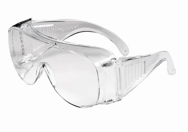 ОЧКИ: универсальные очки с панорамным защитным стеклом увеличенного размера из оптически прозрачного поликарбоната со сверхтвердым двусторонним водостойким покрытием для защиты от абразивов защитное стекло устойчиво к химическому воздействию и к стальной шерсти с двух сторон широкий заушник для пов