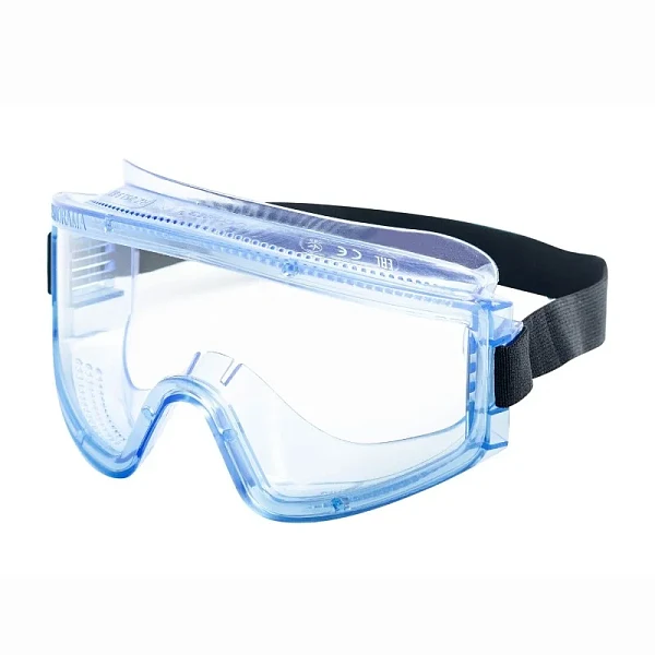 Очки с прямой вентиляцией с панорамным защитным бесцветным стеклом из поликарбоната (РС super) с незапотевающим покрытием изнутри, снаружи устойчивым к истиранию и царапанию. Мягкий корпус из ПВХ. Регулируемая наголовная лента. Обеспечивают защиту глаз от высокоскоростных летящих частиц со среднеэне