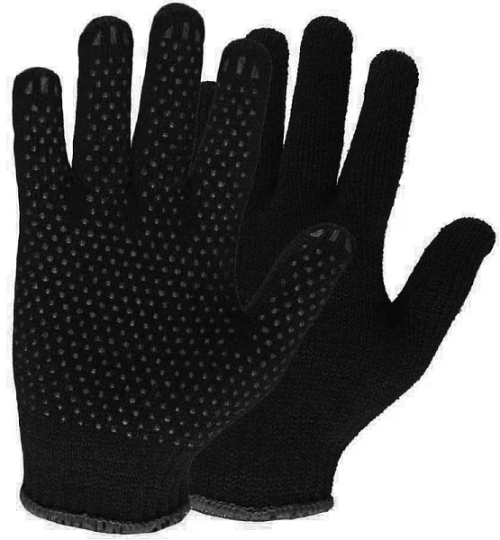 Перчатки трикотажные из синтетических нитей с вложением хлопкового, шерстяного волокна (15% шерсть, 15% хлопок, 70% акрил) с ПВХ покрытием Ширина 10 см, длина 25см.