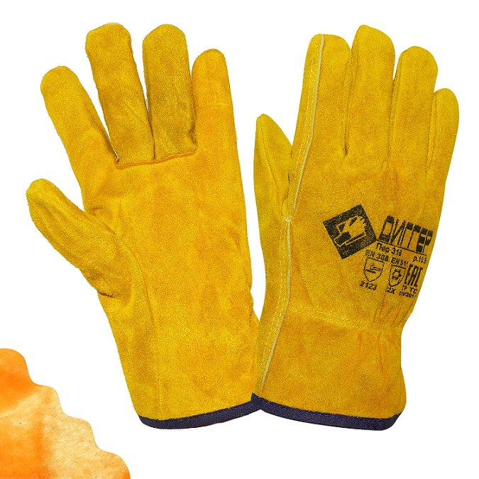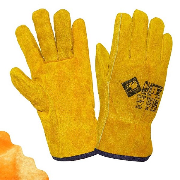 ПЕРЧАТКИ: для защиты от механических воздействий и пониженных температур из цельного спилка с подкладкой из искусственного меха, длина 270 мм спилок КРС - только спинная часть шкур, прошедших предварительный отбор, спилок однородный, сорт АВ (1,4+/– 0,2 мм), шлифованный, желтого (золотого) цвета на