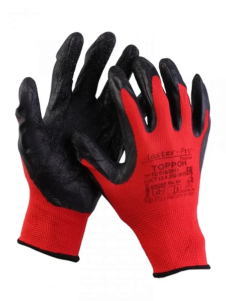 Перчатки нейлоновые с рельефным латексным покрытием, красно-черные