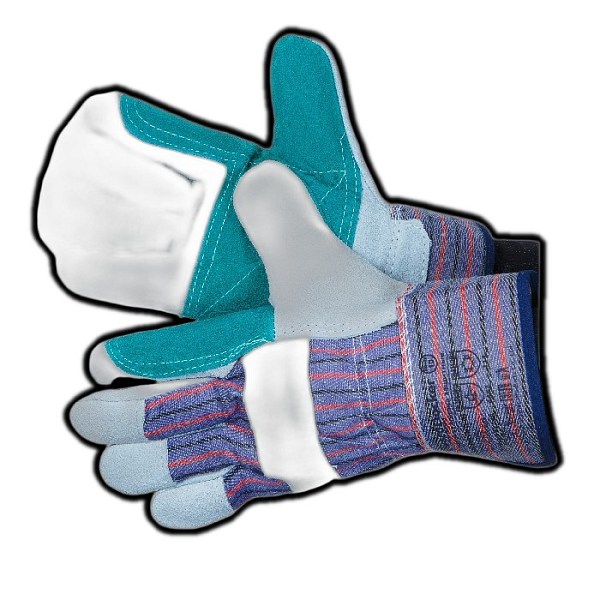 Перчатки комбинированные из серого спилка и красно-фиолетовой ткани, с защитным наладонником