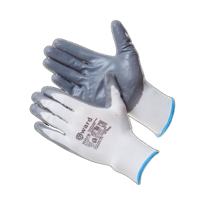 Суперэкономичные нейлоновые перчатки белого цвета, покрытые нитрилом серого цвета.