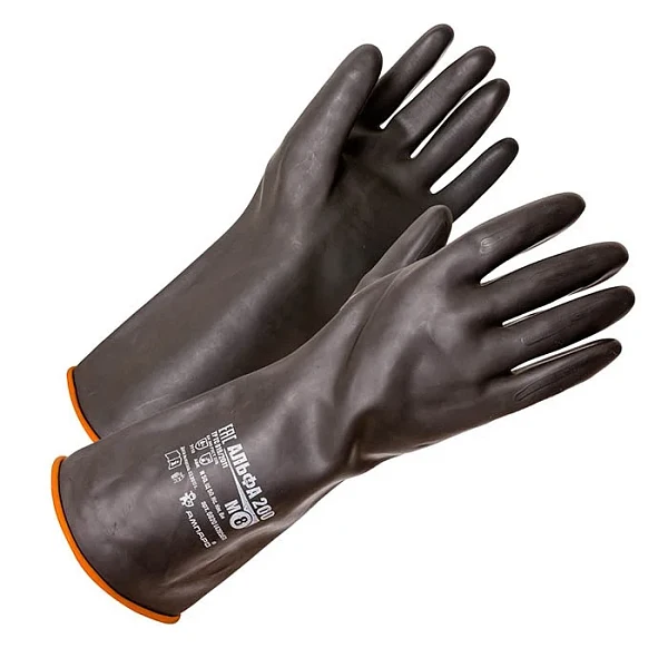 ХИМОСТОЙКИЕ ПЕРЧАТКИ «АЛЬФА® 200» Латексные двухслойные химостойкие перчатки для общепроизводственных работ, защиты рук при работах с разбавленными щелочами (до 50%), кислотами (до 80%) и их солями, неароматическими (алифатическими) углеводородами, растительными и животными маслами и жирами, а также