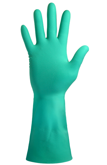 Многоразовые химостойкие перчатки из нитрила с внутренним хлопковым напылением и рифленой ладонной частью. Манжета раструб. Стойкость к химическому воздействию водных растворов кислот и щелочей средних и высоких концентраций, органических растворителей, продуктов нефтепереработки (масла, бензин, кер